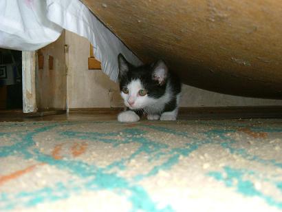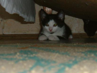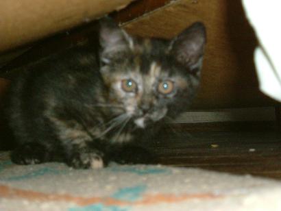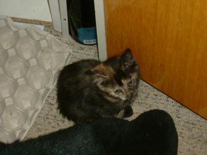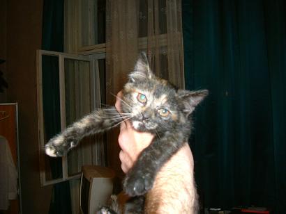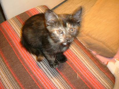 Teknőc leány, mint az anyja, akihez még mindig szívesen odabújik. Az emberek iránt érdeklödő, igen kommunikatív cicus. Nevét egészen pici korában kapta, ugyanis ő volt - már akkor is - a legkisebb a cicák között és a színezete is igen furcsa volt. Eleinte úgy tűnt, hogy alul marad az evolúciós versenyben (hiába nyílt ki a szeme neki először). Nem tudtuk, hogy mi lesz vele (megmarad-e), de aztán szépen fejlődött, és egyértelműen a családom kedvencévé vált.