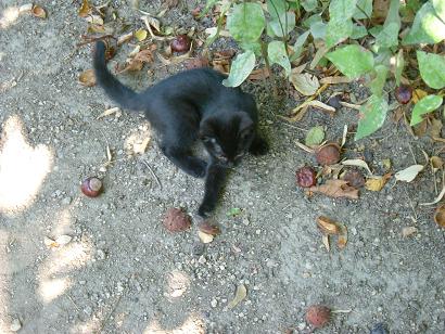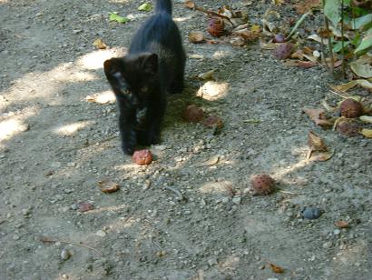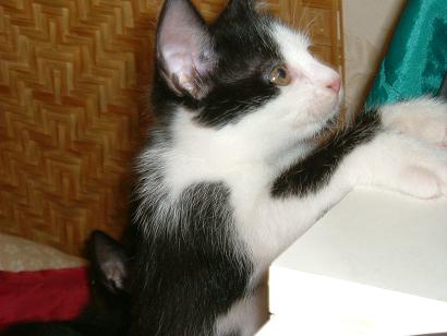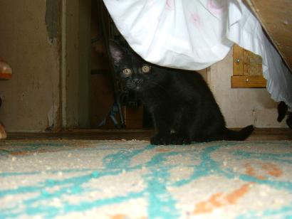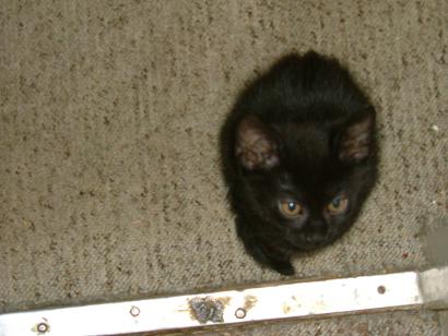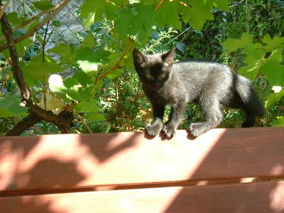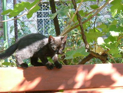 Mélységes feketeségéből csak a szeme csillan ki általában, mókamesternek viszont így is tökéletes. Őt érdeklik legjobban az emberek, gyorsan barátkozik. Sokat futkározik, játszik, de legjobban "dolgokra" szeret felmászni. Kifejezetten nem fut át senki előtt az úton, ha mégis, annak szerencséje lesz. Vidám cica, szomorúság ellen kitűnő.